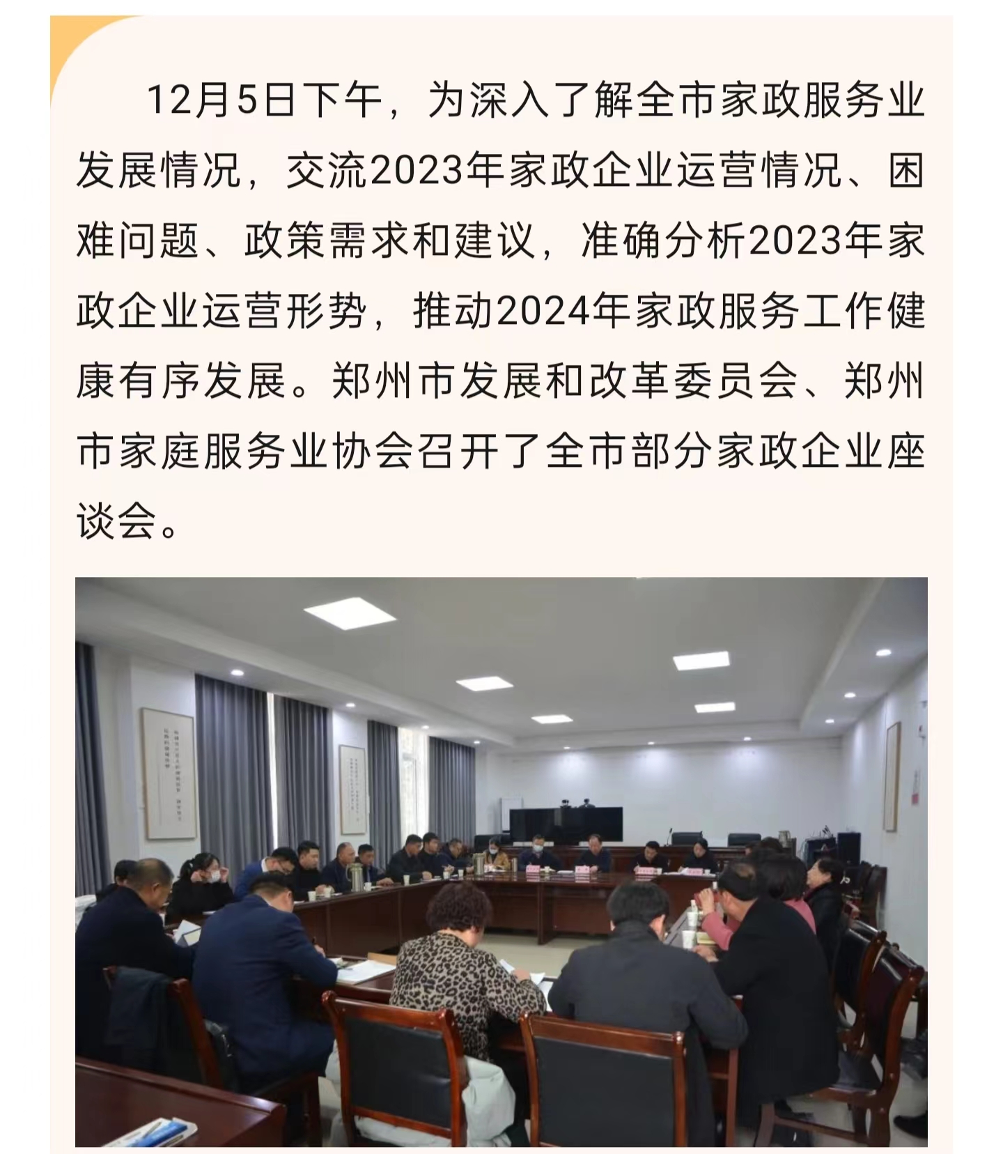 12月5日下午,為深入了解全市家政服務(wù)業(yè)發(fā)展情況,交流2023年家政企業(yè)運營(yíng)情況、困難問(wèn)題、政策需求和建議,準確分析2023年家政企業(yè)運營(yíng)形勢,推動(dòng)2024年家政服務(wù)工作健康有序發(fā)展。鄭州市發(fā)展和改革委員會(huì )、鄭州市家...