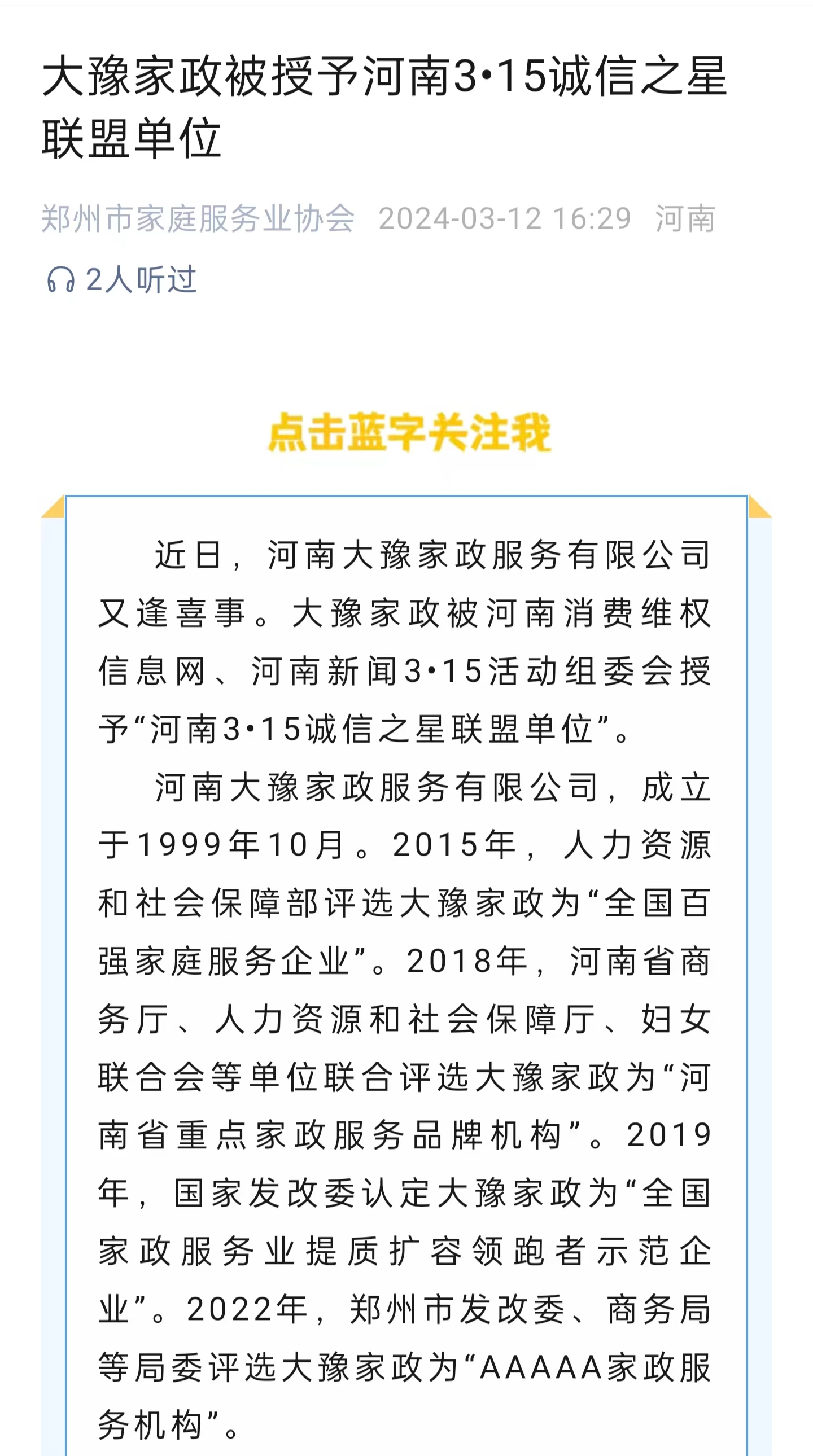 大豫家政被授予河南3?15誠信之星聯(lián)盟單位