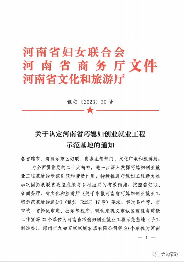 近日,由河南省婦女聯(lián)合會(huì )、河南省商務(wù)廳、河南省文化和旅游廳聯(lián)合發(fā)布豫婦(2023)30號文件《關(guān)于認定河南省巧媳婦創(chuàng )業(yè)就業(yè)工程示范基地的通知》。河南大豫家政服務(wù)有限公司被授予河南省巧媳婦創(chuàng )業(yè)就業(yè)工程示范基地(巾幗家政服務(wù)類(lèi))