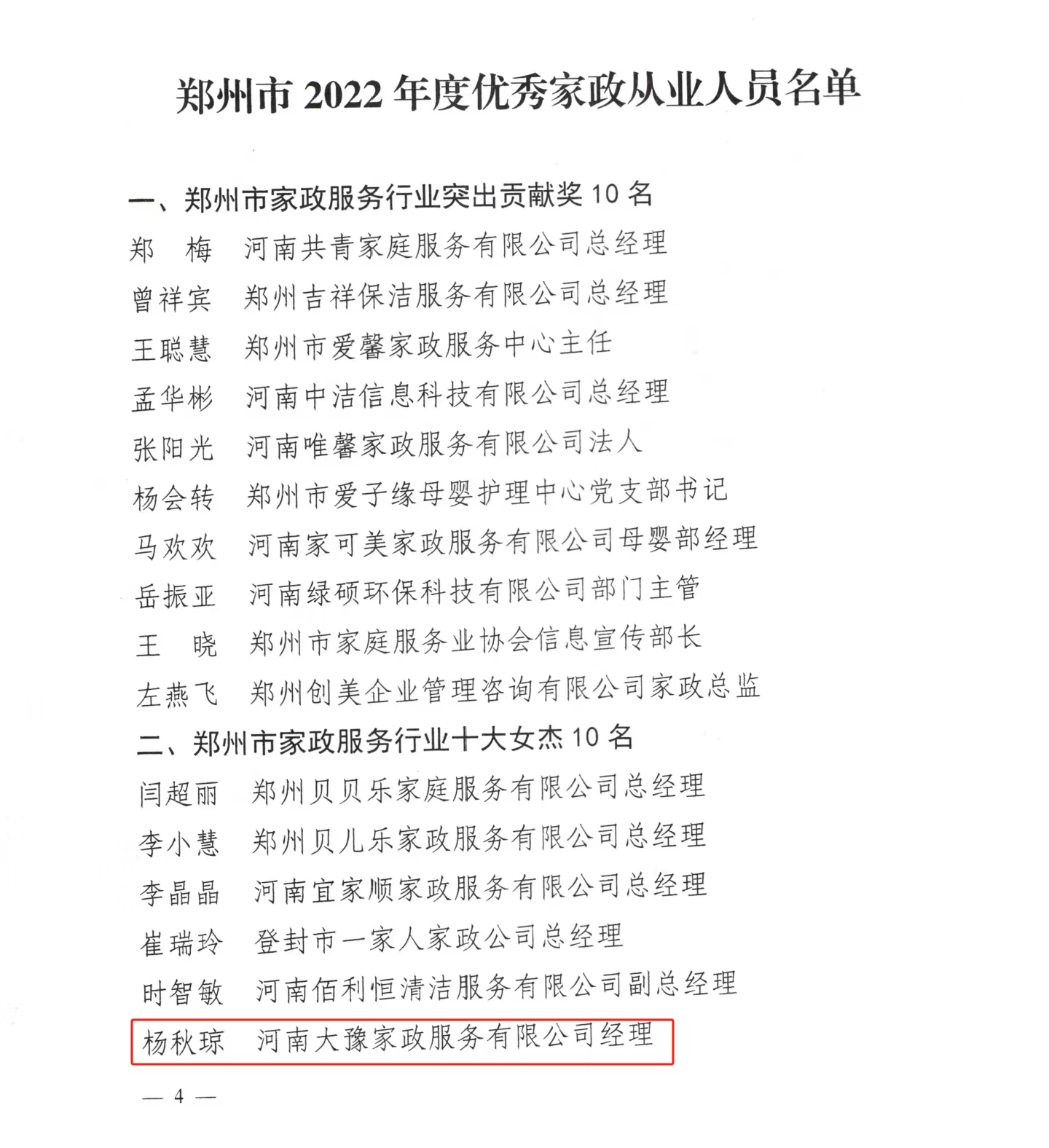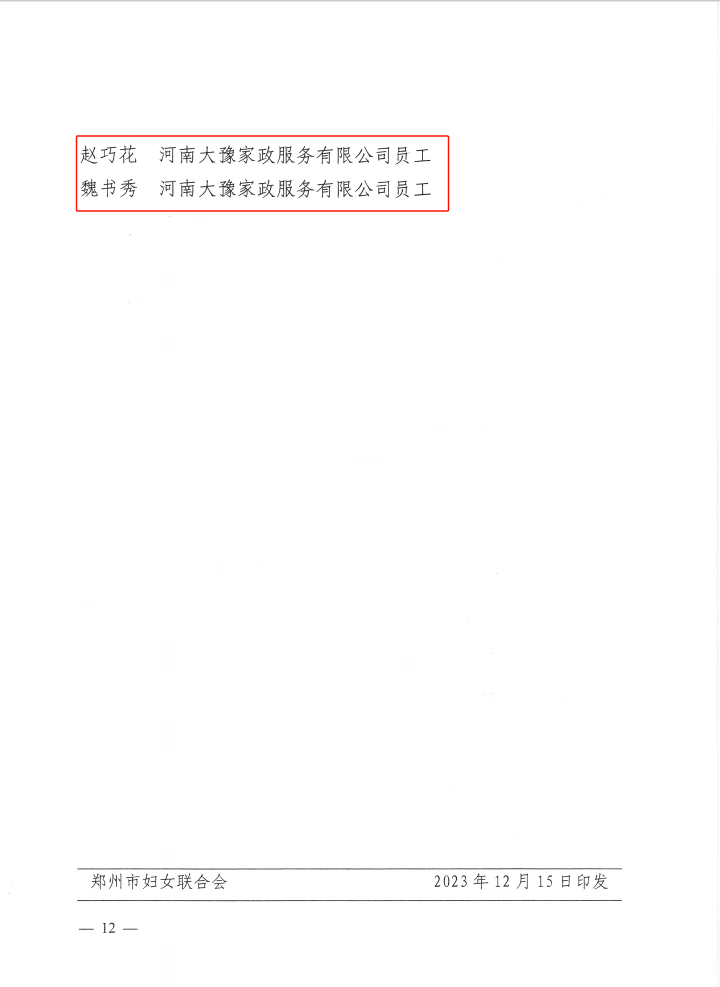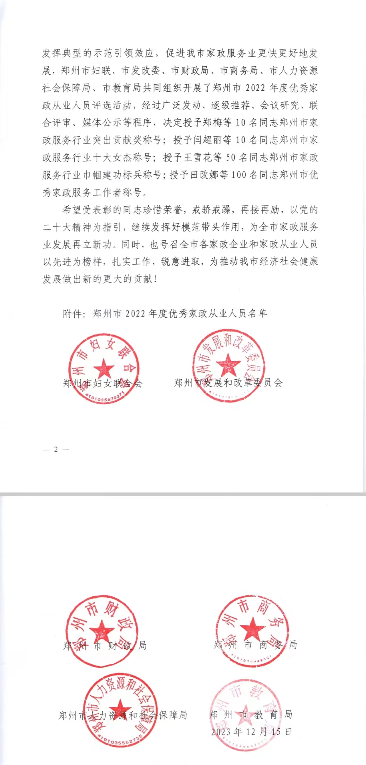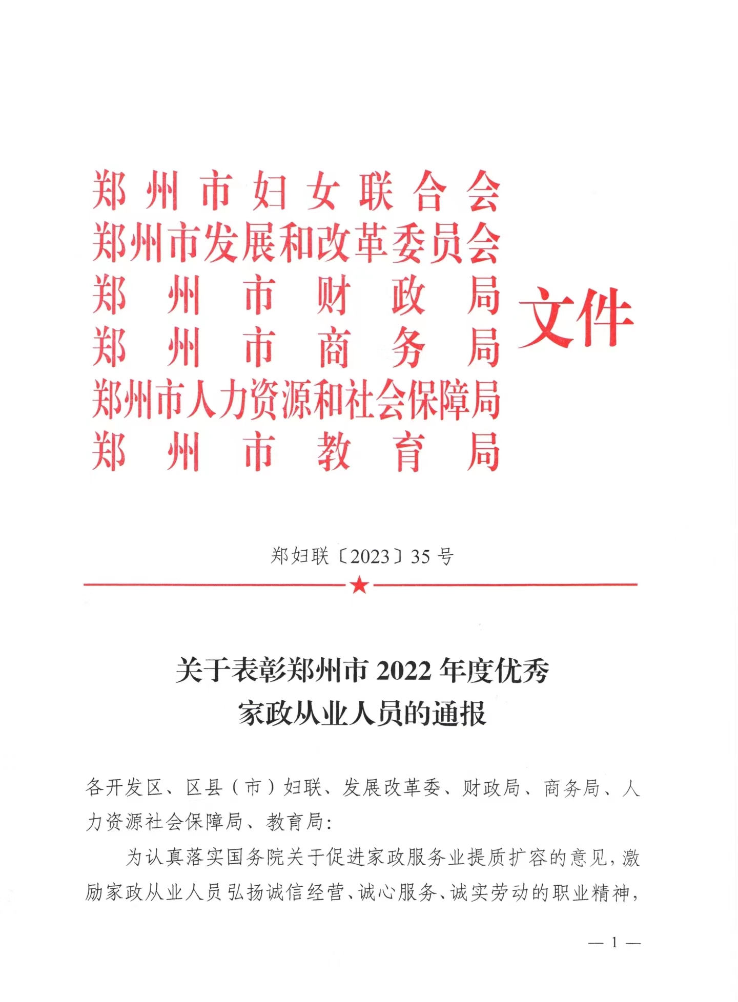 鄭婦聯(lián)關(guān)于表彰鄭州市2022年度優(yōu)秀家政從業(yè)人員的通報