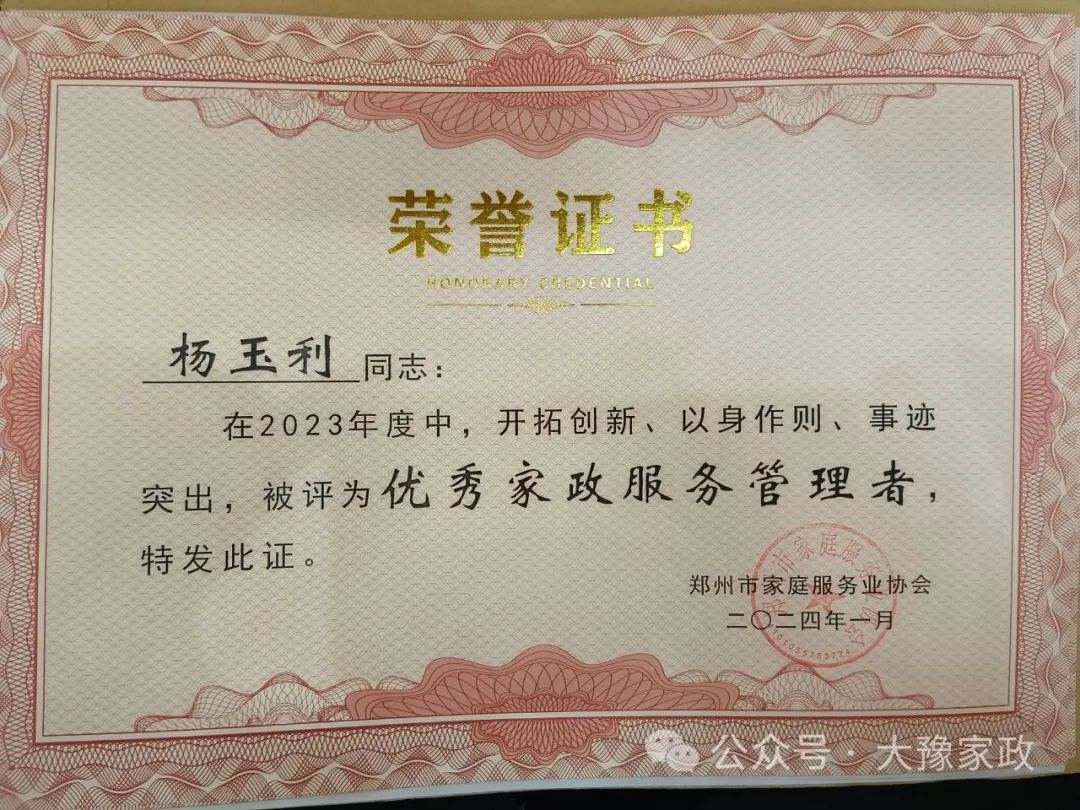 公司楊秋瓊女士榮獲“鄭州市家政服務(wù)行業(yè)十大女杰”。