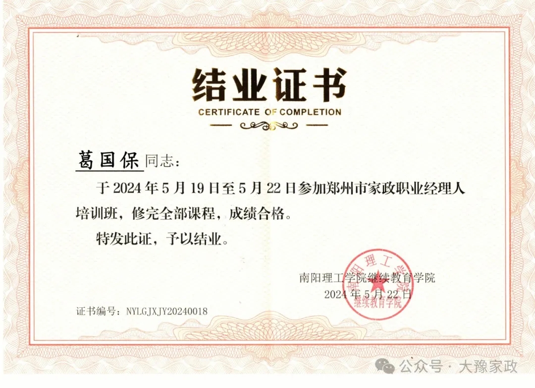 家政職業(yè)經(jīng)理人培訓不僅為學(xué)員們搭建了一個(gè)在學(xué)術(shù)氛圍中探索、進(jìn)步、創(chuàng )新的平臺,更是一個(gè)展示最新研究成果與方法的窗口,一個(gè)讓新理論、新知識、新觀(guān)念得以碰撞交融的舞臺。  鄭州市家政職業(yè)經(jīng)理人培訓班,有針對性地設計了專(zhuān)題培訓課程體系,采用經(jīng)典案例分析、座談研討、行業(yè)交流、現場(chǎng)教學(xué)等形式,讓我們全面學(xué)習企業(yè)最新發(fā)展趨勢、更新知識、拓寬視野、開(kāi)闊眼界,能夠將所學(xué)知識和理論運用到實(shí)際工作中,從而有效提升家政行業(yè)服務(wù)的質(zhì)量與效能,全面助推家政服務(wù)業(yè)提質(zhì)擴容。  大豫家政公司經(jīng)理人楊玉利、葛國保參加了此次培訓,積極學(xué)習并獲得結業(yè)證書(shū)培訓期間我們收獲滿(mǎn)滿(mǎn),學(xué)有所思、學(xué)有收獲、學(xué)有所長(cháng)。前路漫漫,但只要我們揚帆啟航,終將抵達理想的彼岸,我們堅信,這次培訓將是我們前行路上的加油站和助力事業(yè)騰飛的有力翅膀。